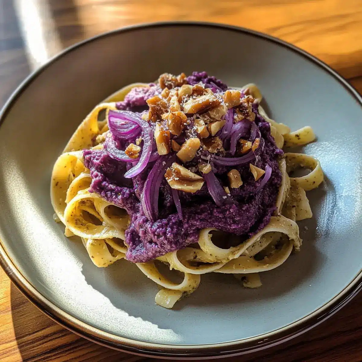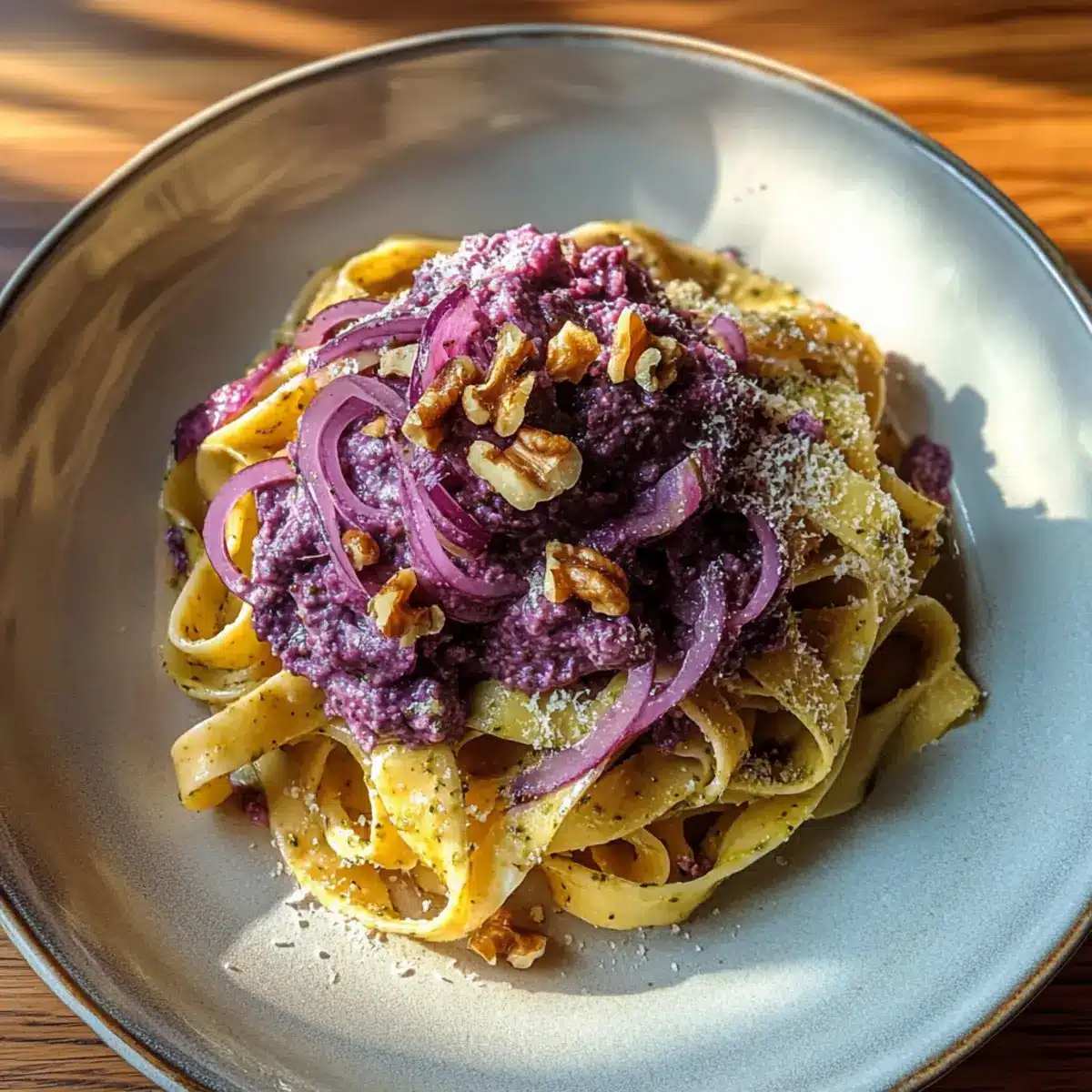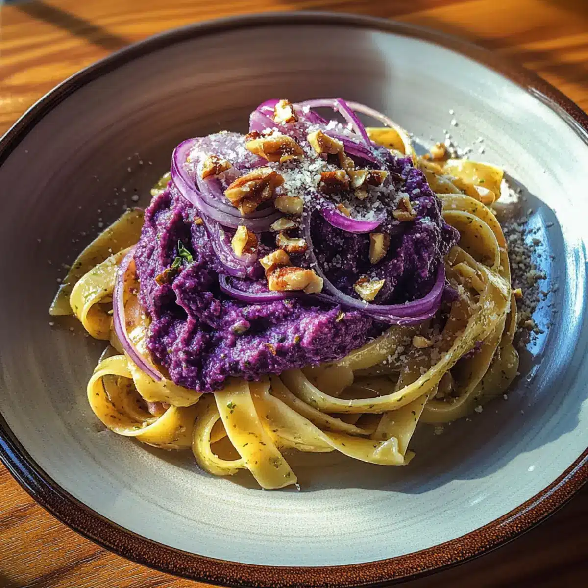 Verteile die Tagliatelle auf Tellern und toppe sie mit den karamellisierten Zwiebeln und den gehackten Walnüssen. Serviere das Gericht sofort, damit die Aromen frisch und lebendig sind. Genieße deine selbstgemachte Tagliatelle mit lila Pesto!