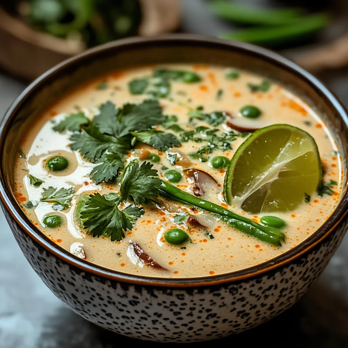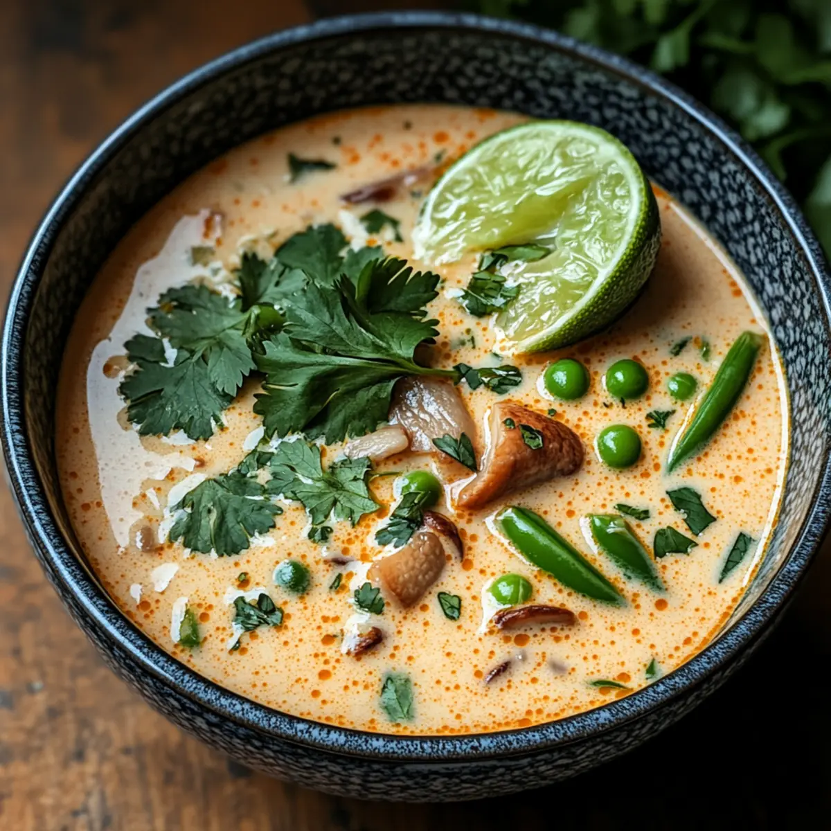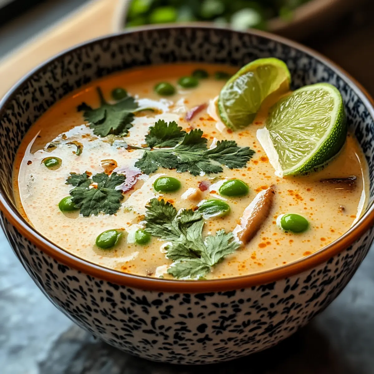 Exotische Aromen: Diese thailändische Kokosnuss-Suppe vereint die erfrischenden Geschmäcker von Limette und frischem Koriander, die dich sofort nach Thailand versetzen.