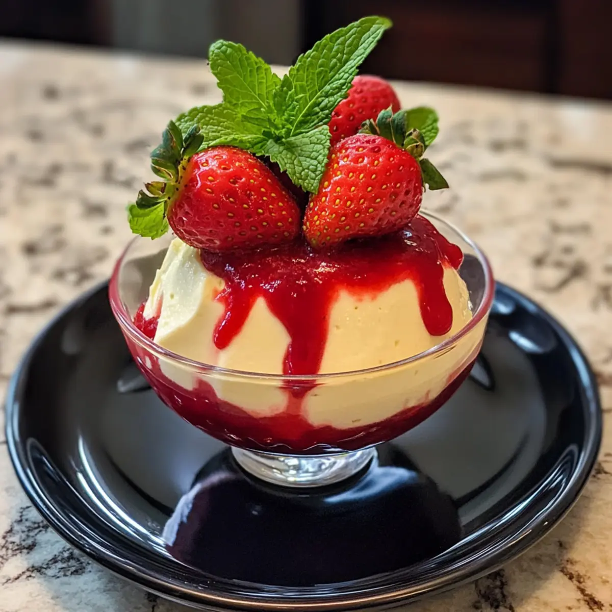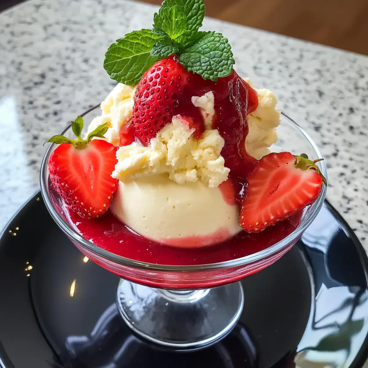 Frische Erdbeeren püriert mit etwas Zucker bringen eine fruchtige Süße, die perfekt mit der Cremigkeit des Parfaits harmoniert. Die leuchtenden Farben sorgen für einen festlichen Look. -